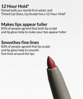 يتم إقران محدد الشفاه مع المستحضر الأول من نوعه في العالم ، وهو تركيبة فريدة من نوعها تثبت محدد الشفاه في مكانه ليدوم لمدة تصل إلى 10 ساعات ، مع الحفاظ على ترطيب الشفاه. يُنشئ لمسة نهائية ناعمة غير لامعة مقاومة للتلطخ ، مما يقلل من إعادة الاستخدام ويحافظ على لون شفتيك لفترة أطول.