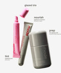 مجموعة من ثلاثة مستحضرات أساسية مغذية من الرود لتلميع بشرتك وشفتيك - تضم حليب التزجيج، ولون الشفاه الببتيد الببتيد وعلاج الشفاه الببتيد.