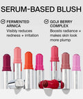 A serum-based, high-pigment blush with 70%+ skincare and proprietary complexes that hydrate and make skin look more plump in a longwear, glassy balm.