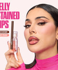 Available in 8 lip stain colors, pair with one of our Faux Filler Jelly Lip Oils to recreate Huda’s jelly-stained lip makeup look.